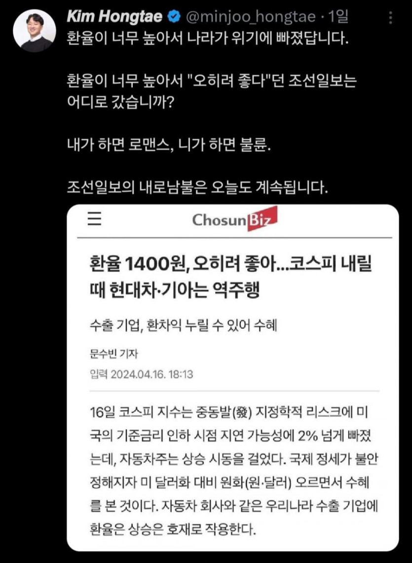 잡담 환율 높아서 "오히려 좋다"던 조선일보.jpg