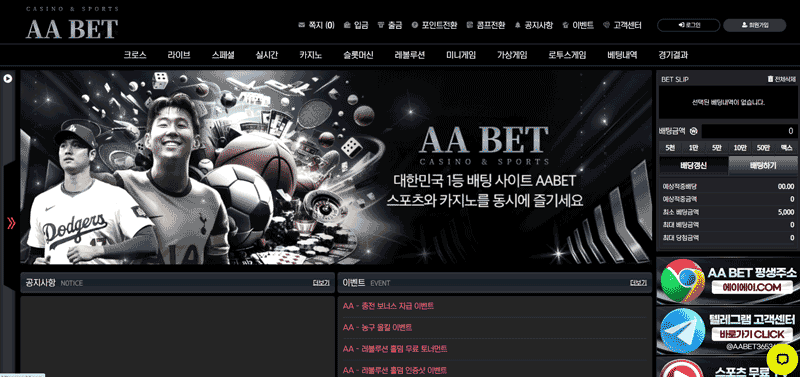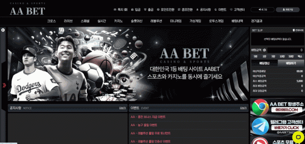 AA BET은 스포츠와 카지노를 동시에 제공하는 종합 플랫폼이다. 스포츠 베팅은 국내외 주요 리그를 모두 아우르며, 실시간 경기 데이터와 연동된 베팅 시스템을 운영한다. 여기에 더해 슬롯머신, 카지노 테이블, 레볼루션 홀덤 같은 카지노 섹션을 강화하면서 폭넓은 이용자층을 확보했다. 특히 한국 시장에서 "스포츠와 카지노를 한 곳에서 즐길 수 있다"는 점은 중요한 경쟁력이 된다.