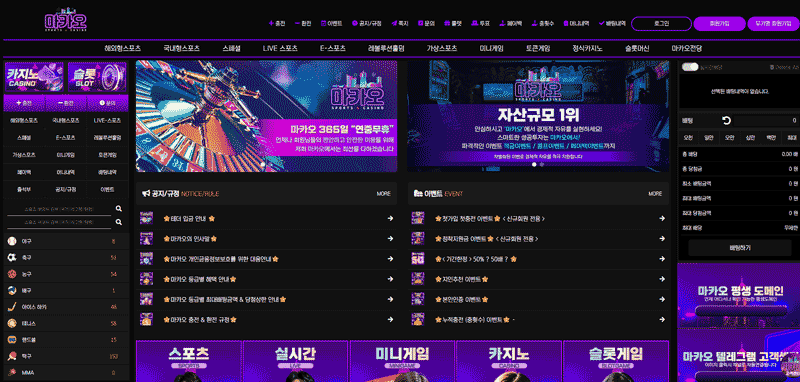 마카오는 온라인 스포츠와 카지노를 통합 제공하는 대형 플랫폼으로, 최근 국내외 베팅 커뮤니티에서 빠르게 성장세를 보이고 있다. 사이트 전반에 퍼플 계열 색상과 네온 스타일을 강조하여 현대적인 감각을 전달하며, 스포츠, 카지노, 슬롯, 미니게임 등 다양한 섹션을 균형 있게 구성하고 있다. 특히 ‘365일 연중무휴 서비스’와 ‘자산규모 1위’를 강조하며, 안정성과 규모 면에서 강한 인상을 남기고 있다.