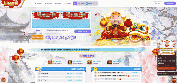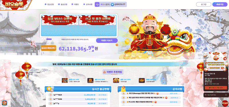 바오슬롯의 메인 페이지는 아시아 전통 양식의 배경과 함께 밝은 톤을 사용하여 친근감을 주고 있다. 화려한 슬롯 배너와 이벤트 알림창은 직관적으로 배치되어 있으며, 회원가입 및 입금/출금 버튼은 상단에 고정되어 사용자가 쉽게 접근할 수 있다. 모바일 환경에서도 최적화된 반응형 구조를 지원하고 있어, 스마트폰 중심의 국내 이용자들에게도 불편함이 없다.