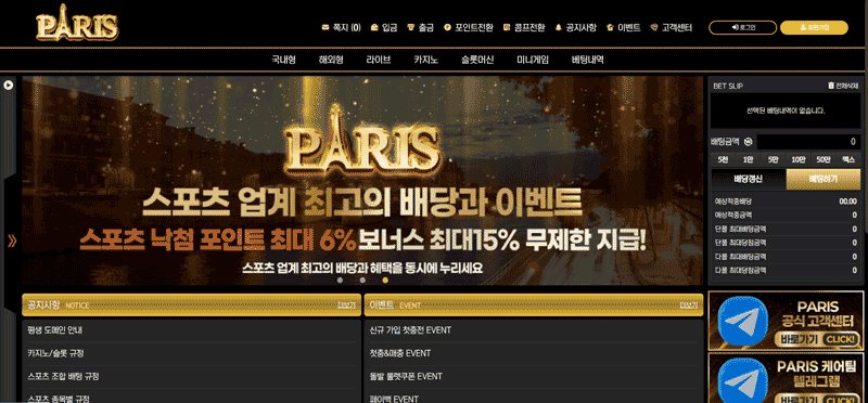 - 보너스 이벤트: 첫충, 매충, 슬럿보너스, 스페셜 패키지 등