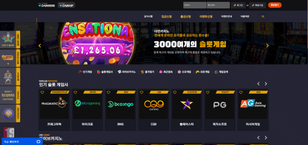 다인 카지노는 다크 테마 기반의 고급스러운 UI와 노랑 포인트 컬러로 강한 시각적 대비를 주는 온라인 카지노 플랫폼입니다. 메인 화면에서는 다양한 슬롯게임 공급사 로고와 주요 카테고리가 한눈에 들어오며, 이용자 친화적인 탐색 메뉴가 인상적입니다. 특히 3,000여 개의 슬롯게임을 보유하고 있어 슬롯 유저에게 매력적인 선택지가 됩니다.