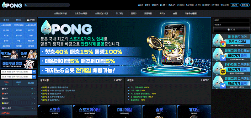 총평 — 퐁벳카지노는 다크 네온 콘셉트로 기억 점유율이 높고, “첫충 40% / 매충 15% / 롤링 100% / 매주 5% 개인정산 / 신규가입 40%” 등 명확한 프로모션 카피를 전면에 배치하여 초기/재방문 동기를 강화합니다. 좌우 패널 구조가 명확해 탐색성이 우수하고, 보안 공지(사칭주의) 노출이 적극적입니다. 다만 모든 보너스에는 약관이 따르므로 세부 조건을 확인하고, 입출금/출금 승인 단계에 대한 이해와 기록 관리(TxID·이력 캡처)가 필요합니다. 이벤트 변동성이 높은 만큼, 최신 변동 사항은 공식 공지와 이벤트 페이지에서 재확인하시길 권합니다.