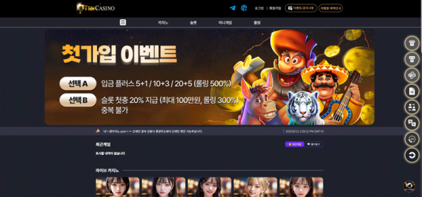 텐카지노의 첫 인상은 “다크 바탕 위 골드 포인트”라는 뚜렷한 콘셉트다. 스크린샷 메인 배너에 “첫가입 이벤트”가 매우 크게 배치되고, 선택형 구조가 적용된다. 선택 A: 입금 플러스 5+1 / 10+3 / 20+5 (롤링 500%), 선택 B: 슬롯 첫충 20% (최대 100만 원, 롤링 300%)가 명확히 표기되며 “중복 불가”가 함께 안내된다. 이처럼 신규 유저 유입 단계에서부터 본인이 선호하는 플레이 성향에 맞춰 혜택을 택하게 하는 방식은 커뮤니케이션이 간결하고 이해가 쉽다. 우측 사이드에는 원형 아이콘 버튼들이 라이트 골드 글로우로 강조되어 공지, 쪽지, 24h 등 빠른 접근 기능을 제공하는 형태다.