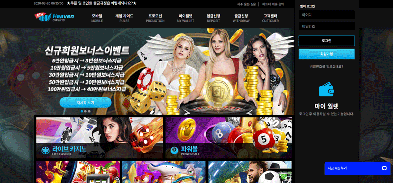 스포츠, 라이브 카지노(블랙잭·바카라·룰렛 등), 슬롯, 파워볼/로또형 미니게임, 기타 실시간 베팅 카테고리를 병렬 제공합니다. 게임마다 참여 제한·베팅 한도·제외 시장이 다를 수 있으므로, 종목별 규칙과 이벤트 조건을 함께 확인하세요.
