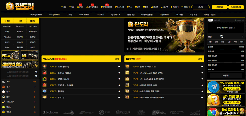 판도라카지노는 **스포츠·카지노·슬롯·미니게임**을 종합적으로 제공하는 플랫폼이다. 게임 서비스의 가장 큰 특징은 카테고리별 세부 구성이 잘 정리되어 있다는 점이다. 예를 들어, 스포츠에서는 **축구·농구·야구·배구·아이스하키·테니스**까지 다양한 리그와 경기를 실시간으로 커버하며, 프리매치와 인플레이 두 가지 옵션을 통해 이용자의 성향에 맞는 베팅이 가능하다. 또한 **E-스포츠** 항목을 별도로 운영해 리그 오브 레전드, 발로란트, 스타크래프트 등 인기 종목에 대한 접근성을 강화하고 있다.