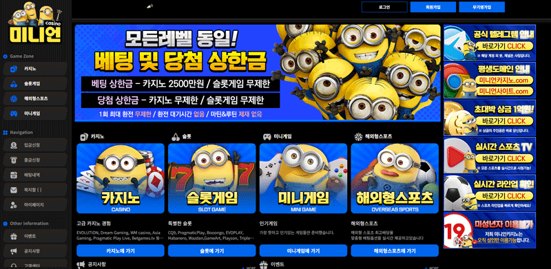 미니언카지노는 캐릭터 테마를 활용해 친숙한 브랜드 이미지를 구축한 온라인 카지노로, 슬롯·라이브 카지노·해외형 스포츠·미니게임을 통합 제공하며 신규 유저 온보딩과 장기 이용자 리워드를 병행한다. 핵심 철학은 **간편성·안정성·예측 가능성**에 있으며, 이벤트는 신규·충전·페이백·콤프·코인 수수료 지원까지 카테고리별로 세분화되어 있다.