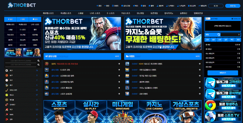 토르벳(THORBET)은 스포츠 중심의 통합 베팅 플랫폼으로, 해외형·국내형 스포츠와 LIVE 스포츠(인플레이), 라이브 카지노, 슬롯, 가상스포츠, 미니게임을 한 계정에서 제공한다. 신규에는 **첫 충전 40% 또는 쿠폰 3장**을, 기존 회원에는 **입금 플러스·무한 입금 플러스·주간 페이백** 등 순환형 리워드를 제공한다.