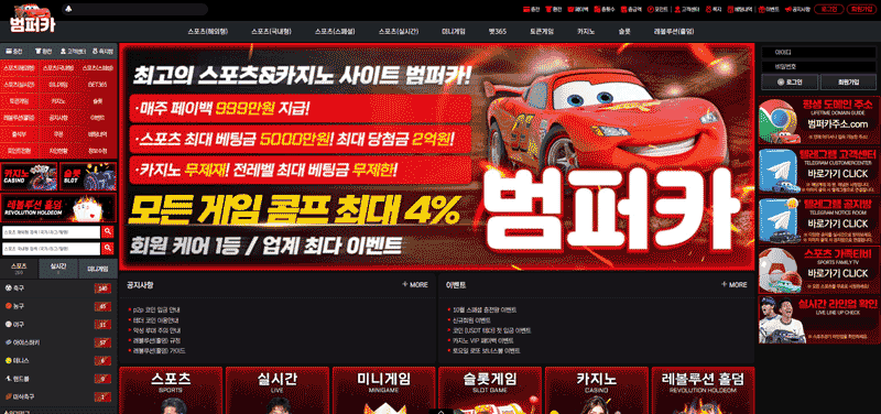 범퍼카는 스포츠·카지노·슬롯·레볼루션(홀덤)까지 전 카테고리를 한 계정에서 운용하는 통합형 사이트다. 메인 카피에 따르면 주력은 **주간 페이백 제공**, **스포츠 최대 베팅 5,000만원·당첨 2억원**, **전 레벨 카지노 베팅 제한 해제**, **콤프 최대 4%**로 정리된다. 이벤트 메뉴와 공지 영역이 분리되어 있어 결제·정산·룰 안내와 프로모션 소식을 각각 추적하기 쉽다. 커뮤니티 보증 연동 배너를 전면에 배치해 신뢰 프레임을 강조하는 운영 기조가 보이며, 코인(USDT) 채널과 P2P 안내 공지를 통해 최근 트래픽이 많은 결제 동선을 우선 지원하는 구조다. 신규 유입은 “신규회원 이벤트 + 첫 입금(USDT) 보너스”로 견인하고, 잔존은 VIP 레벨업·무제한 입플·일일/월간 랭킹형 “충전왕” 구성을 통해 유지하는 방식이다.